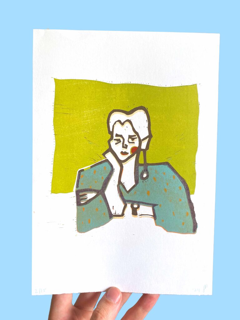 Is een linosnede die met de hand is gedrukt. Hierdoor is ieder werk uniek! A6 op stevig wit papier