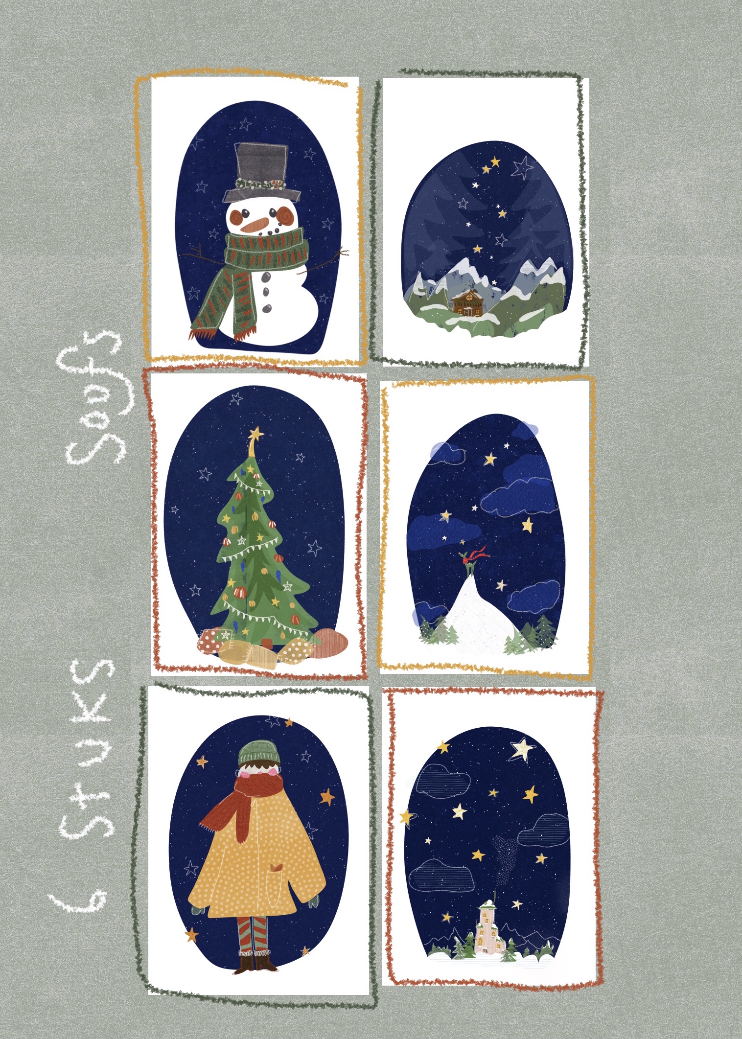Een mooie set van 6 verschillende winterse kaarten. A6 formaat; op mooi stevig papier gedrukt!