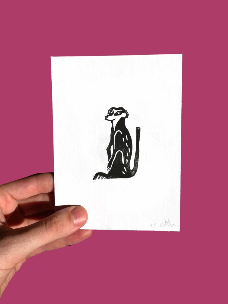 Is een linosnede die met de hand is gedrukt. Hierdoor is ieder werk uniek! A6 op stevig wit papier